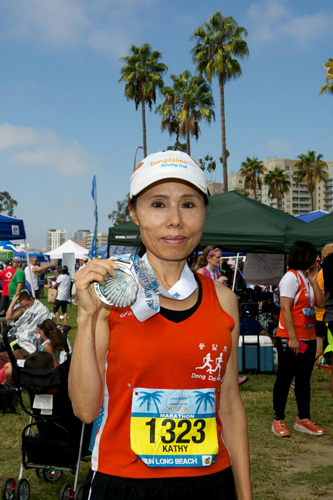 애나하임에 거주하는 주광옥(60)씨는 지난 주말인 12일 열린 ‘롱비치 국제 마라톤대회’에 출전해 3시간58분40초로 60~64세 여성 연령 부문에서 1등의 영예를 안았다. 주씨는 2016년 보스턴 마라톤대회 출전권도 따냈다.