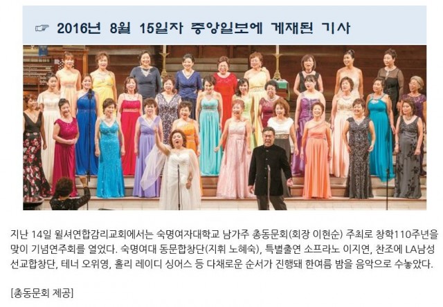 2016년 8월 14일(일) 19:00 윌셔연합감리교회에서 열린 기념연주회를 성황리에 마쳤습니다. 이 풍성한 음악의 장에서 숙명가족과 관객들은 숙명인의 저력과 세상을 바꾸는 부드러운 힘을 느끼셨을 것입니다.
