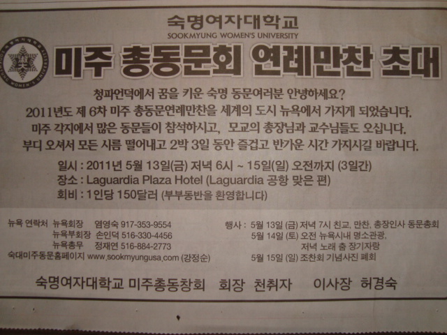 이제 다음주 금요일 5월13일에 시작되는 숙대 미주 총동문회가 다가왔군요.그동안 우리 동문들 모두 열심히 물심양면으로 도와주셔서 감사하며 4월30일 한국일보 광고가 나갔습니다.그동안 동문들께 초대장 메일을 보낸다고 했지만 주소 변경되어 못받으신분,여러 이유로 알지 못하셨던 분들도 신문광고로 알게되어 전화로 오시겠다고 약속하신 분들이 늘고 있습니다.뉴욕,뉴저지 동문님들 부디 많이 참석하셔서 숙명의 힘,단합을 보여주는 커다란 계기가 되었으면 하는 바램입니다.감사합니다.