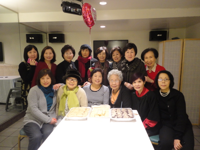 1월 생신을 맞으신 공선증 선생님과 2월생 박영희씨,허경숙 생일 축하,축하. 맛있는 야생 찹쌀떡과 콩찰떡,공선생님이 구워오신 과자를 맛있게 먹으며 뉴욕의 숙명 가수 김선미씨 신사동 그사람을 부를 때면 모두들 까르르,모처럼 윤현숙 대 선배님도 참석 하셨습니다. 정희숙씨는 뒷줄 오른쪽 세번째 입니다.박영희씨는 사정이 있어 참석 못했고 오늘은 2월14일 발렌타이데이로 정말성회장님이 모두 사랑한다고 쵸코렛과 풍선으로 분위기 업.