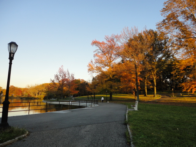 단풍이 절정인데 해가 뉘엿 지는 붉은색이 감도는 호숫가.