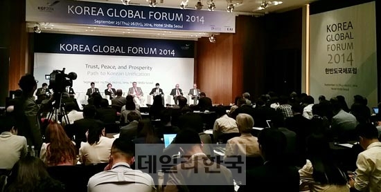 통일부와 동아시아연구원이 25일 서울 장충동 신라호텔에서 '신뢰·평화·번영, 한반도 통일의 길'을 주제로 공동 주최한 2014 한반도국제포럼(KGF·Korea Global Forum)에서 한국, 미국, 중국, 일본, 러시아 전문가들이 토론하고 있다. 사진=김종민 기자