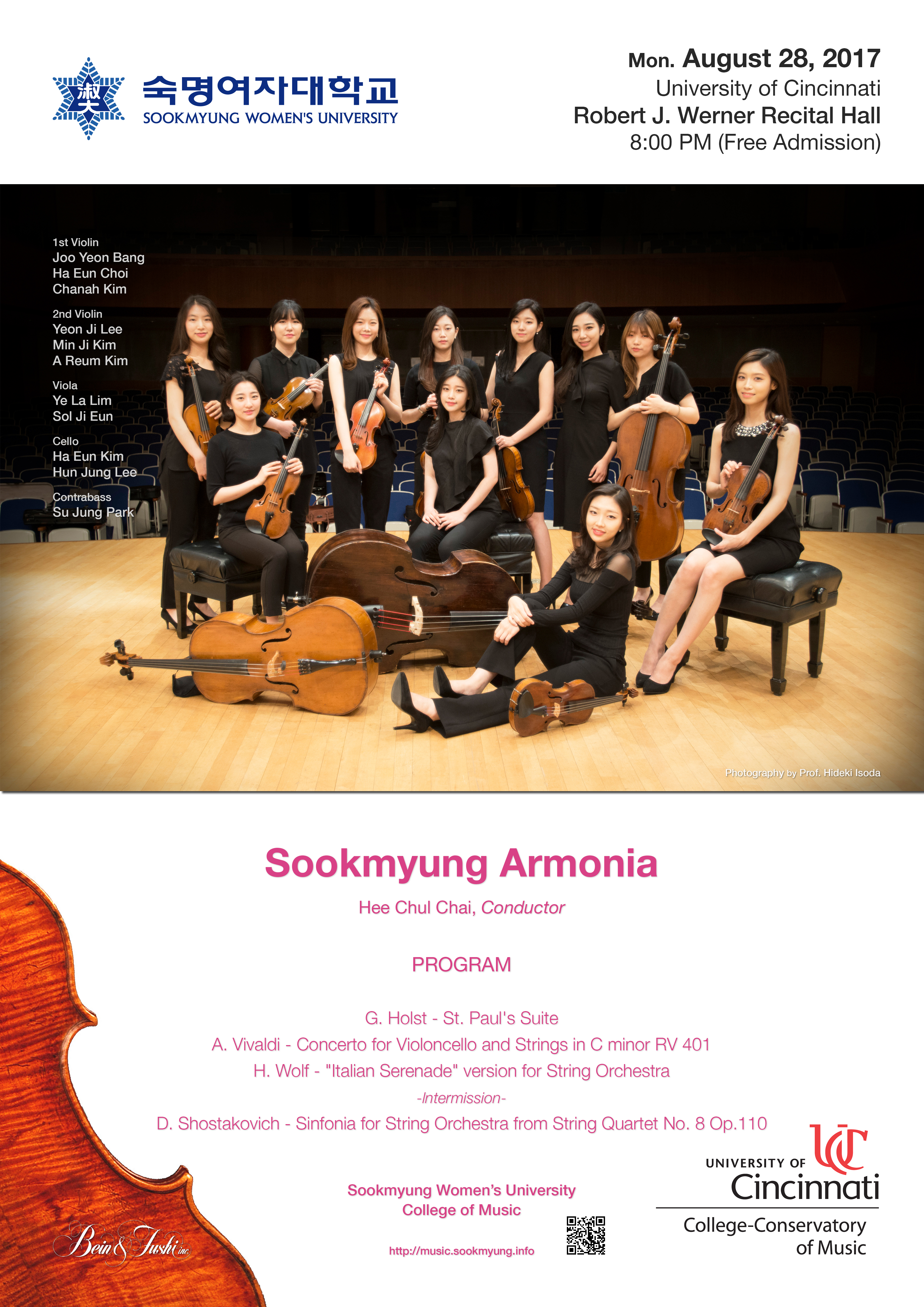 CONGRATULATIONS ! 숙명여자대학교 음악대학 STRING ORCHESTRA * SOOKMYUNG ARMONIA* 의 이번 UNIVERSITY OF CINCINNATI, OHIO 에서의