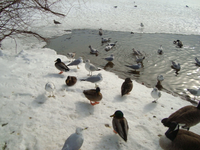눈덮힌 산에 안개비는 내리고 겨울이 되어도 어떤 나무 잎사귀는 절대 안떨어 지겠다고 버티고 있어 앙상한 나무숲을 그런대로 푸근하게 해주고 공원의 오리는 갈매기의 겨우살이를 양보하며 살고있고 눈속에서도 생명력을 느낄수 있게 해준답니다.