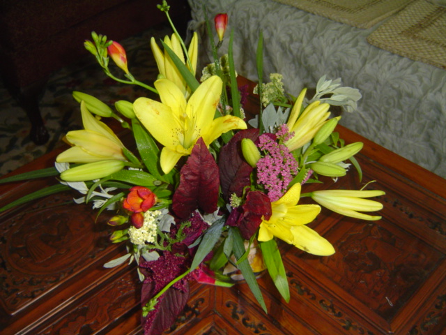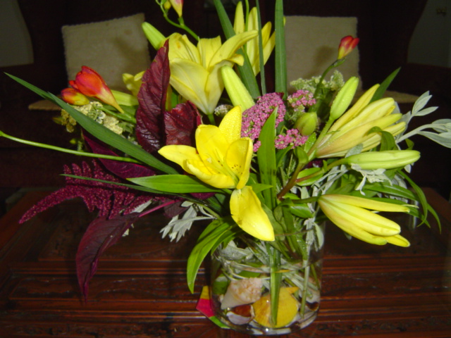 오늘의 꽃꽂이는 바다에 가면 봃 수 있는 소라,조개,고동껍질을 원통 꽂병의 밑에 깔고 꽃의 소재는 Freesia, Amaranthus(맨드라미), Yarrow, LA Lily,Irtemesia입니다.