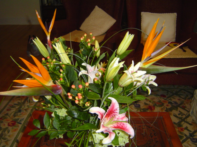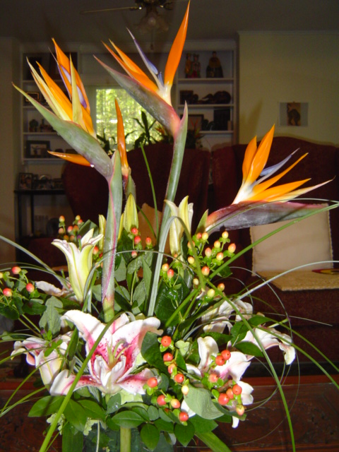 꽃꽂이 재료는 Bird of Paradise, Hypericum, Oriental Lily, Bear Grass입니다.