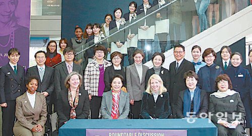 러셀 세계여성문제 대사 숙대 강연 :: 12월 5일 서울 숙명여대 중앙도서관 세계 여성문학관에서 미국 버락 오바마 행정부의 글로벌 여성 관련 이슈를 책임지는 캐서린 러셀 세계여성문제 전담대사가 간담회를 연 뒤 참가자들과 기념촬영을 했다. 러셀 대사는 유엔이 정한 세계여성폭력추방 주간을 맞아 “여성 경력 단절은 경제적 관점에서 국가가 해결해야 할 과제”라고 말했다. 앞줄 왼쪽부터 미셸 아웃로 주한미대사관 외교관, 레슬리 바셋 주한 미 부대사, 류지영 새누리당 국회의원, 러셀 대사, 황선혜 숙명여대 총장, 박동은 유니세프 한국위원회 부회장.
