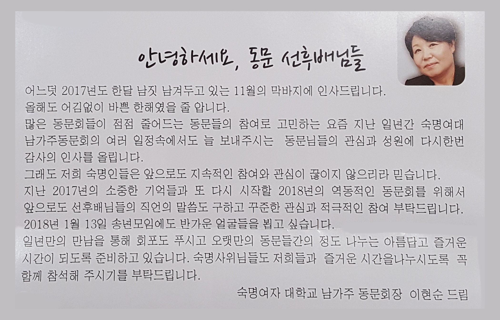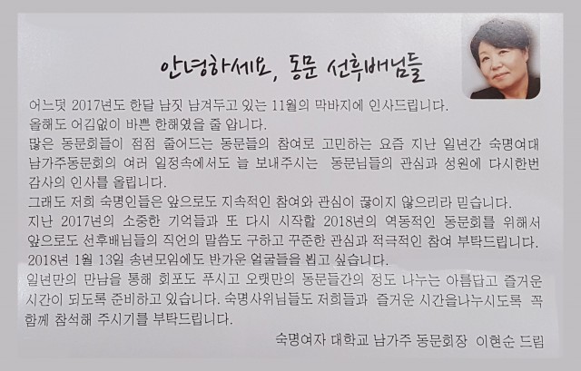 새해를 맞아 남가주 동문회 회장님과 임원단, 모든 동문님들께, 아름다운 신년회 행사를 성황리애 여시기를 소망합니다.