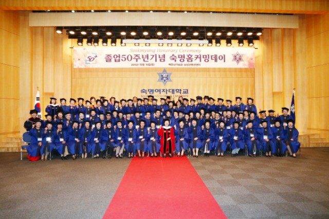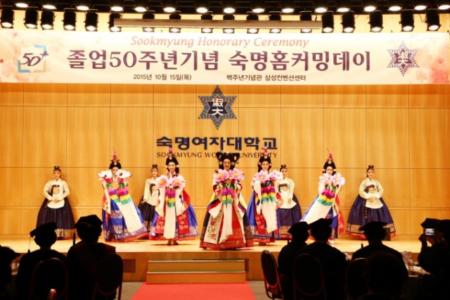 졸업50주년기념 숙명홈커밍데이 개최 !!! 2015년 10월 15일(목) 삼성 컨벤션센더 곱게 눌러 쓴 학사모 아래 화사한 웃음이 가득하다. 거울을 보며 학사복을 입은 맵시를 뽐내니 아무리 봐도 50년 전 그 모습이다. 옆의 친구들과 삼삼오오 모여 기념사진을 찍고 지나간 추억을 화제로 얘기하다보니 시간 가는 줄 모른다. 졸업50주년을 기념하는 학교 행사에 모인 동문들 이야기다. | |||