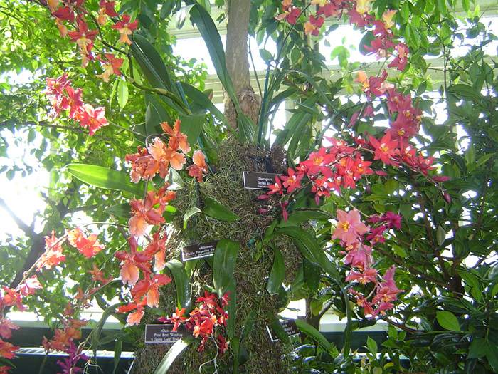 란이 큰 나무에 기생하는 꽃처럼 전시되어 있어요.