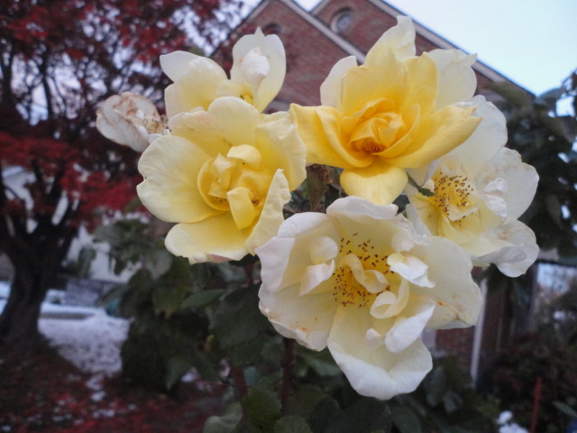 눈속에서도 다알리아,국화,수국,장미가 예쁘지요?눈이 쌓여 하얀길에 저녁 노을이 지며 빠끔이 파란 하늘색과 노을의 조화가 정말 예뻤는데 작은 카메라로 담아내기에는 역부족이었지요.