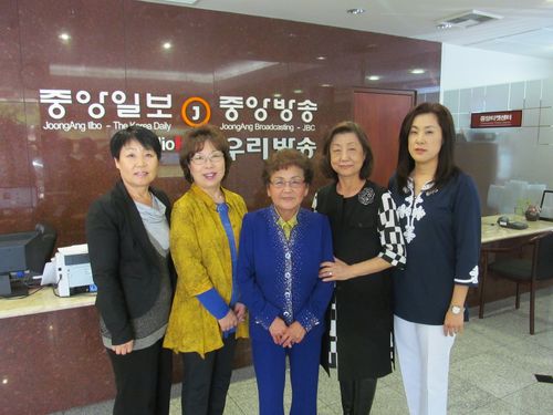 숙명여대 동문회 관계자들이 중앙일보를 방문, 동문들의 참여를 호소했다. 왼쪽부터 이현순 미주총동문회 수석 부회장, 노헤숙 음대 중창단장, 박영희 남가주 부이사장, 최헌자 미주 총동문회장, 유은희 남가주 회장. (상위에 있는 사진)