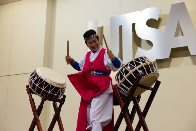 4월11일 공연중 일부분이며 뒷 배경 UTSA ( Univ. Of Texas in San Antonio ) 대학에서 매년 김치 축제를합니다. 4년간 남편( 양재헌 한인회장 재임 시 / 박방자 부회장겸직 홍보담당 재임) 총영사관의 협조와 대학의 협조로 결실을 맺어 이제 학점제로 진행되고있습니다. 약 400 여명의 학생들과 외부 귀빈들께 여러가지 김치 종류와 밥, 불고기를 맛보이고 한국에 대한 홍보를 합니다. 여러 대학생들이 한국에 대하여 지대한 관심이 높고 한국에 영어 총 영사관 홍보로 TALK ( Teach And Learn in Korea program) 즉 한국정부에서 권장하는 프로그램 Korean government service-Learning Scholarship program 입니다.