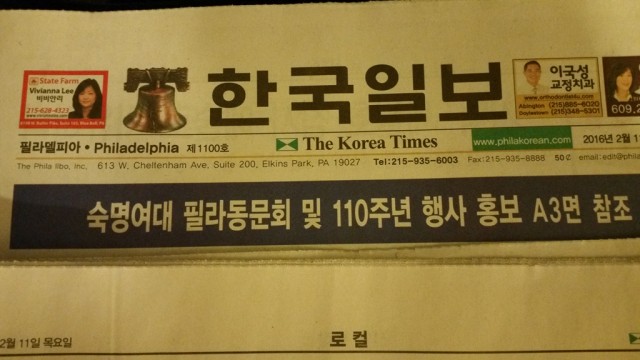 필라델피아 한국일보에 숙명여자대학교 소개 !!!
