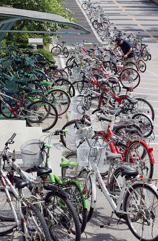 고유가 시대를 맞아 에너지 절약 열풍이 이어지고 있는 가운데 27일 강원 춘천교대에 통학용 자전거가 줄지어 세워져 있다.(춘천=연합뉴스)